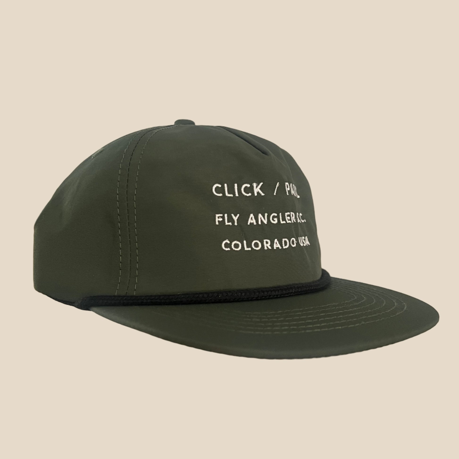 Limited first run of our all-season go-to. Simple, unstructured nylon cap with a flat bill, bill rope, and clicker logo to the left of the snapback. Made in PA on a Brist 5-Panel Cascade.
