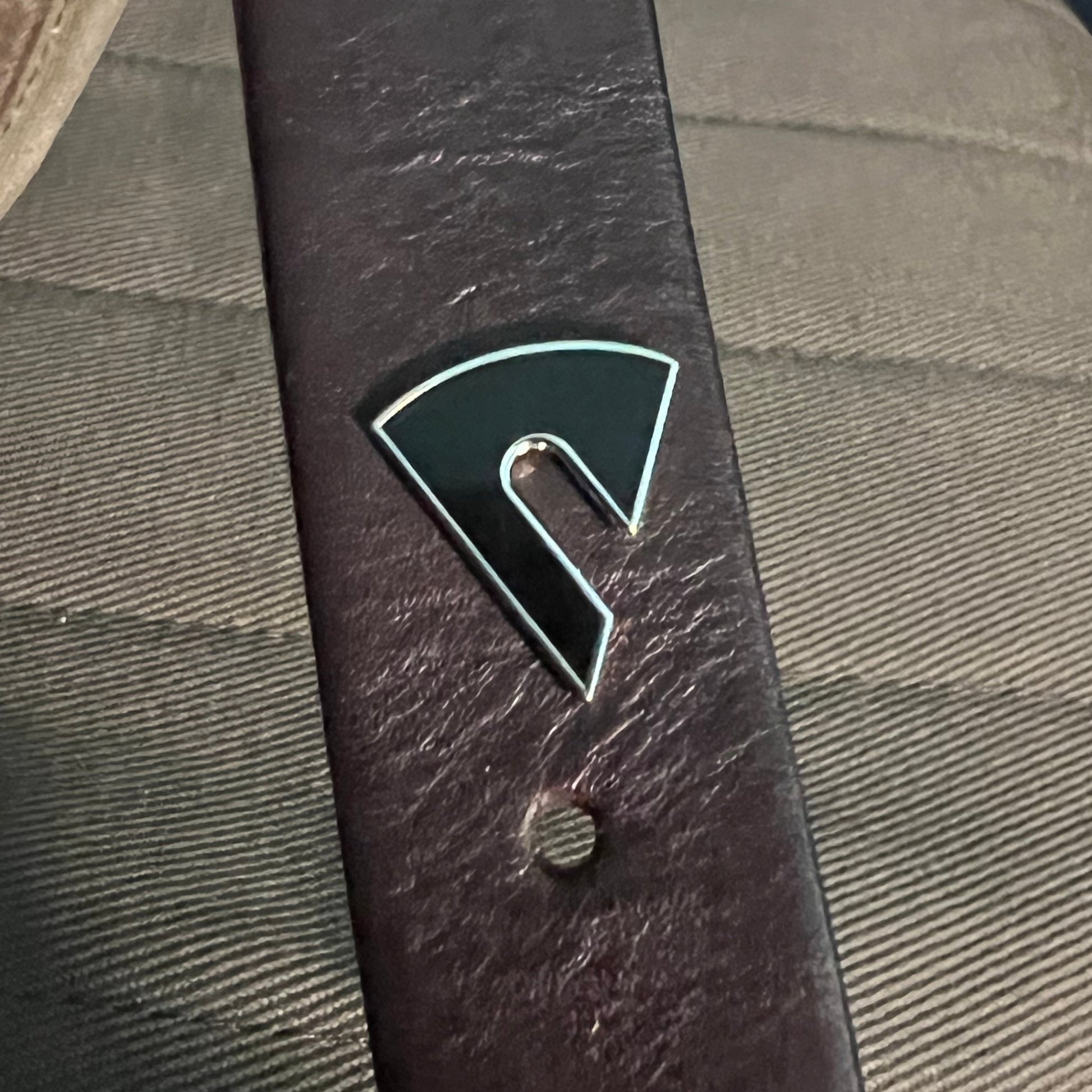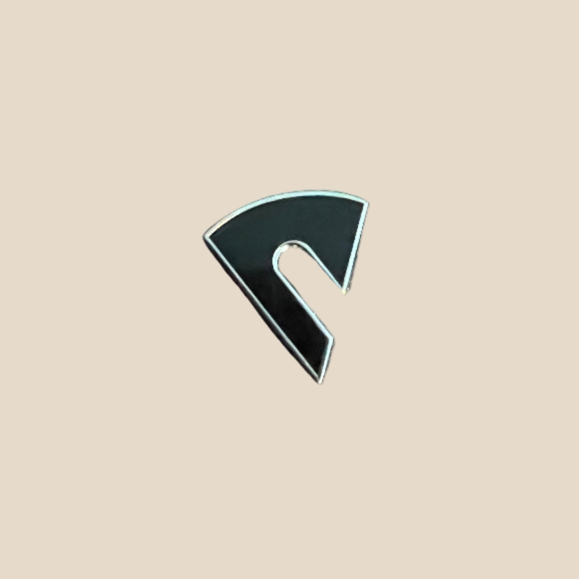 Die-struck, overfilled with black enamel in shiny nickel-plated base, and polished to create a smooth, flush surface.
